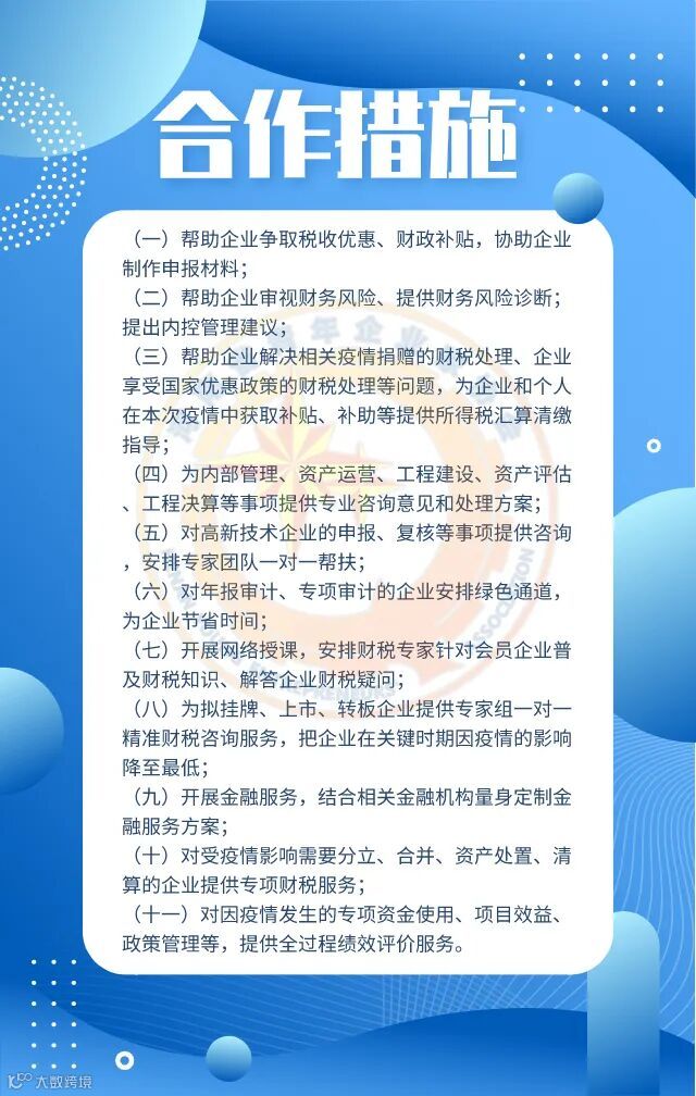 根据双方约定,自本协议签订之日起至2022年12月31日内,河南省注册会计师协会将发挥注册会计师行业专业优势,促进省青企协会员企业用好用足优惠政策、有序复工复产,以提供公益服务、有偿服务两种合作方式为省青企协会员企业提供11项目合作措施。