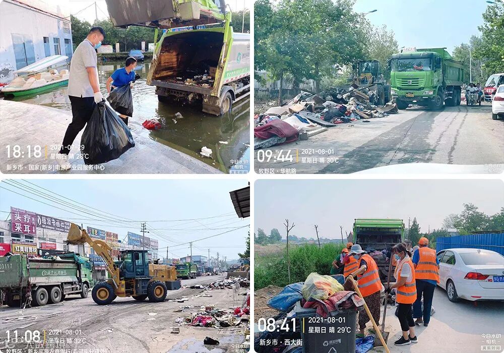 一场突破历史极值的特大暴雨侵袭河南,让灾区人民的生命和财产安全蒙受重大损失。作为此次暴雨重灾区的新乡,更是牵动着全国人民的心。洪灾刚过,疫情又起,为了帮助村民打好灾后重建和疫情防疫这场“双线战”,康盈环保牧野项目第一时间组织动员环卫力量,组织人员30余人,出动铲车4辆、大卡车6辆、大型垃圾压缩车4辆、洒水车和清扫车2辆,第一时间助力民众做好灾后重建工作和疫情消杀工作。