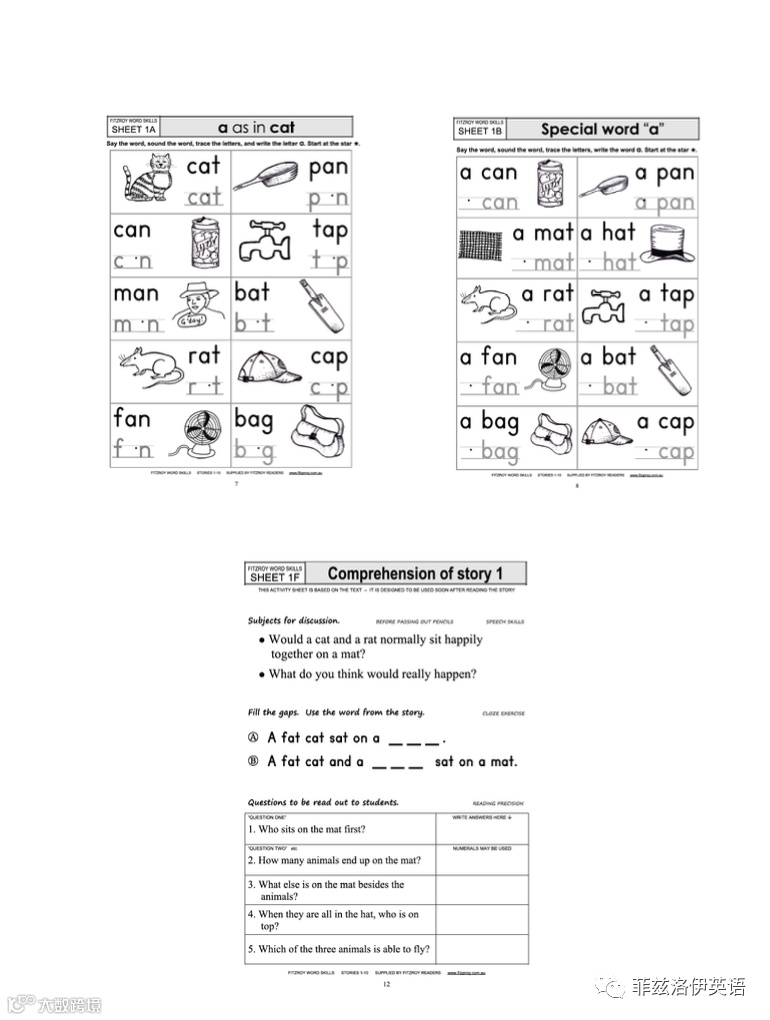 当我们翻到这本书的A页时,教的是菲利普提到的“ar”发ar!的音,如同car里的ar!。如果你正在做这个练习,意味着你在学习读本19,A页就会有练习ar发音的内容,然后B页会练习这本书里的特殊词汇。完成了A页和B页的练习之后,我们建议阅读读本,在阅读完这本书之后,选择任何一页练习都可以,不过,我们建议选用F页,因为F页是阅读理解部分,“你读懂这个故事了吗?” ,F页面提出的问题都是关于这个故事的, 难易程度取决于孩子们的进度。一开始,针对小龄段的孩子,我们只需用一个词来回答问题,然而,当他们读到19本的时候,我们会建议孩子们写一个完整的句子。我们的方法的美妙之处在于步骤保持不变,一旦老师和家长熟悉了第一套,他们就明白了这种教学设置会一直沿用,直到最后一本。先完成A页和B页的练习,再阅读读本,随后回答问题,陪伴着孩子们成长,例如,在《故事1》这个特别的故事中, 我们有一只猫,它和一只老鼠坐在地毯上。当然,在现实生活中这是不可能发生的!