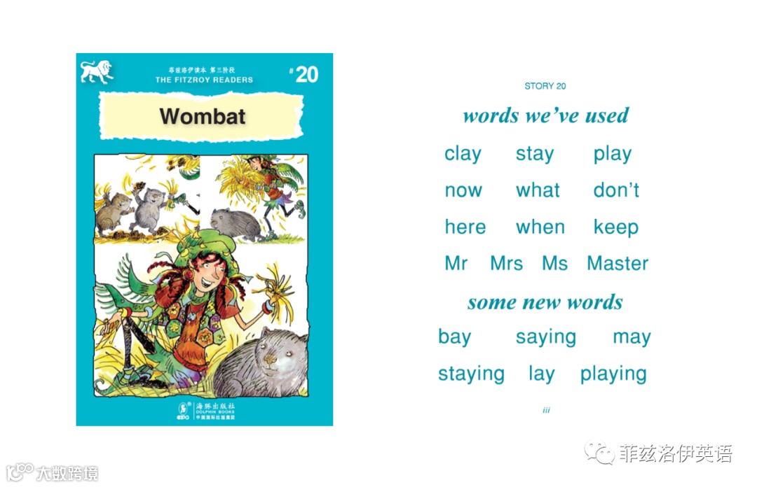 在学习完这10本故事书之后,我们还有另外10本书,用更多的单词和更有趣的故事教授同样的发音规则。之后,我们会继续学习更多的内容,就像菲之前说的,我们用两个或更多的字母来表达一个新的发音。举个例子,让我们来看看这本书《袋熊》,这里重要的发音是ay,就像day这个单词里的ay。英文里有很多的单词也有ay,比如day,say,pay,pray......等等。相似地,ar在mars和farm的发音都是ar!,还有ing出现在英语很多单词结尾的部分,比如sing、thing,以及fish里的sh!发音等等。所以,如果我们一个接一个地学习这些字母组合,我们便慢慢地掌握了英语。