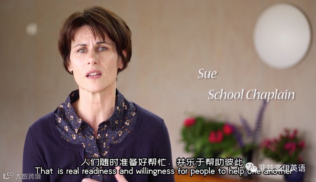 School Chaplain Sue(心灵咨询导师): Someone might be helping someone else find a hat. There is real readiness and willingness for people to help one another.(有的孩子可能正在帮另一个孩子找頂帽子,有的孩子正在找可以帮忙的事情。人们随时准备好帮忙,并乐于帮助彼此。)