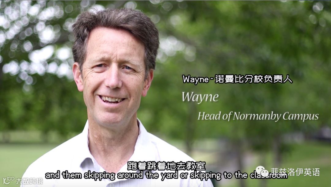 Head of Normanby Campus Wayne(诺曼比分校负责人): I think the first thing it looks like...(首先它看起来就像...) you see the smiles on the kids’ face and them skipping around the yard or skipping to the classroom, (你会看到孩子们脸上洋溢着笑容,在校园里跑着跳着或是兴沖沖地去教室,)so that’s an indicator that they are feeling pretty happy. (这就意味着孩子们是很幸福的。)