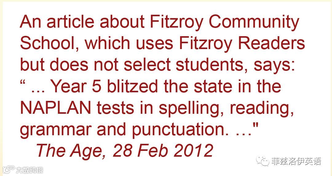 从第一版开始,NAPLAN(澳大利亚国家读写和计算能力评估计划委员会)就已经在澳大利亚所有的学校推行菲兹洛伊读本。为了让用户把菲兹洛伊教学方法作为课程体系放心地使用,我们分享了这个教学体系的实验学校—菲兹洛伊社区学校的下列信息,该学校把菲兹洛伊教材作为英语教学的主导教材。不同于其他一些择优参加测评的学校,菲兹洛伊社区学校从不挑选学生参加国家统测,而是让全校所有学生都参加测评。