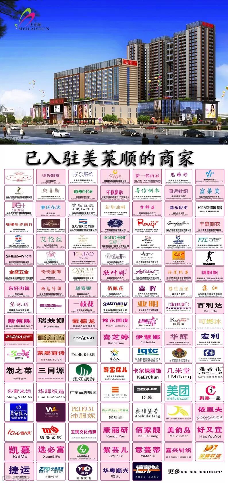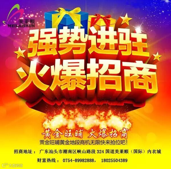 如果你还为生意清淡而烦恼,如果你还为环境不好而无奈,如果你还为不能有更大的发展空间而苦闷。那么。。。。。。入驻美莱顺国际内衣城,助你乘风远航。美莱顺国际内衣城盛大招商!