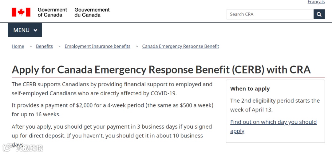 任何加拿大人都不应该被迫在保护自身健康、养家糊口、支付药费、以及照顾家庭成员之间做出抉择。这就是为什么政府推出了加拿大紧急救援补助金(Canada EmergencyResponse Benefit , CERB)的原因。对于符合资格、因 COVID-19 疫情而失去收入的工作人士,这一补助金可每四个星期提供 2,000 加元的计税补贴,最长可达四个月。