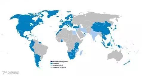 深蓝色部分是新加坡护照免签的国家