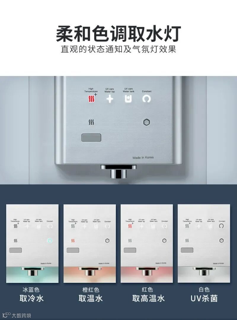 而且本机具备大容量水箱保障全天不间断供水;贴心的温水按钮设计,强化安全,防止烫伤;通过不同色调的取水灯光,直观展示取水状态。