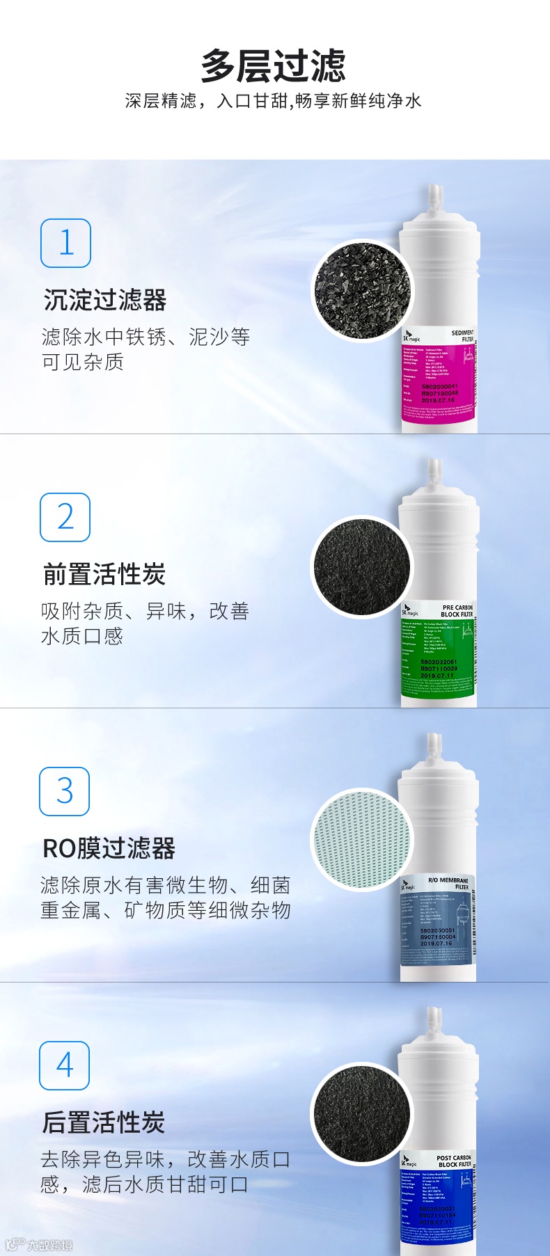 三层RO反渗透膜过滤,滤去水中微生物,矿物,细菌,重金属等有害物质;四层后置活性炭,祛除异色异味改善饮水口感。