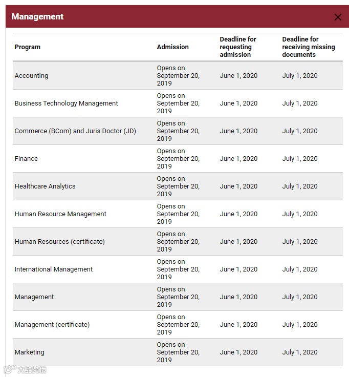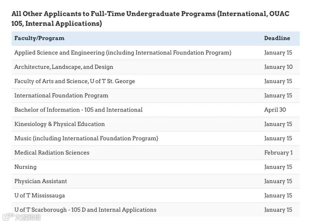 渥太华大学大部分专业的网申截止日为6月1日,材料截止为7月1日,具体专业截止时间参考图片。