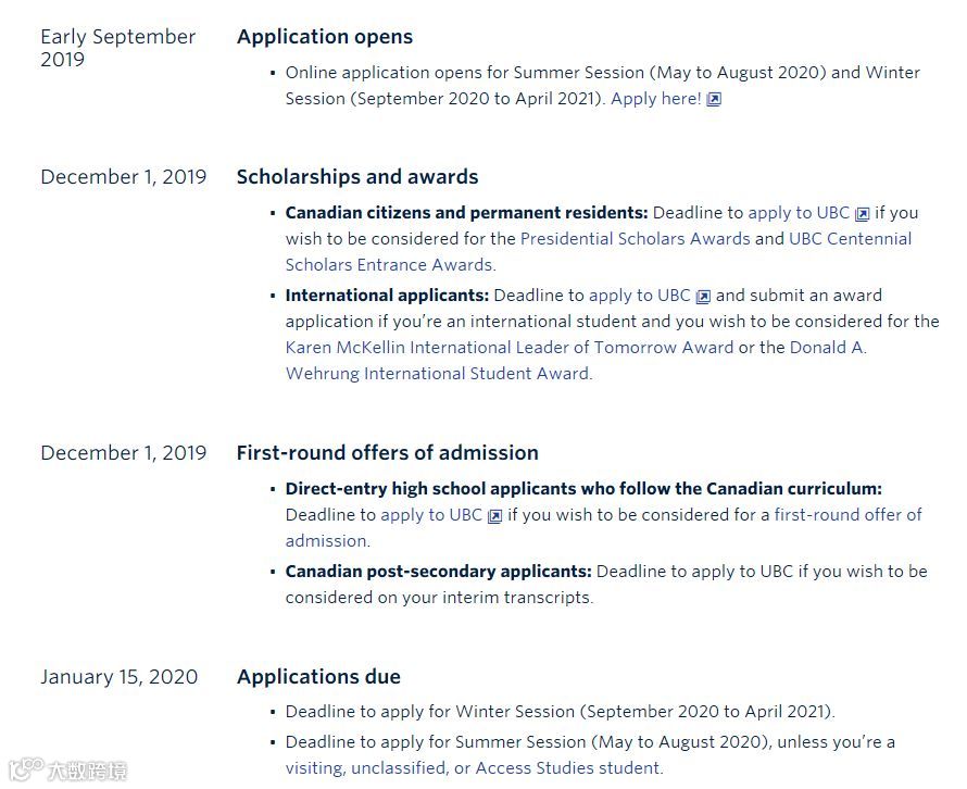 UBC大学在9月初就已经开始申请了,申请截止日为2020年1月15日,但是如果计划申请奖学金则需要在2019年12月1日之前提交申请。国际生补充材料截止时间:国际生3月15日,语言成绩提交截止时间:2月15日。