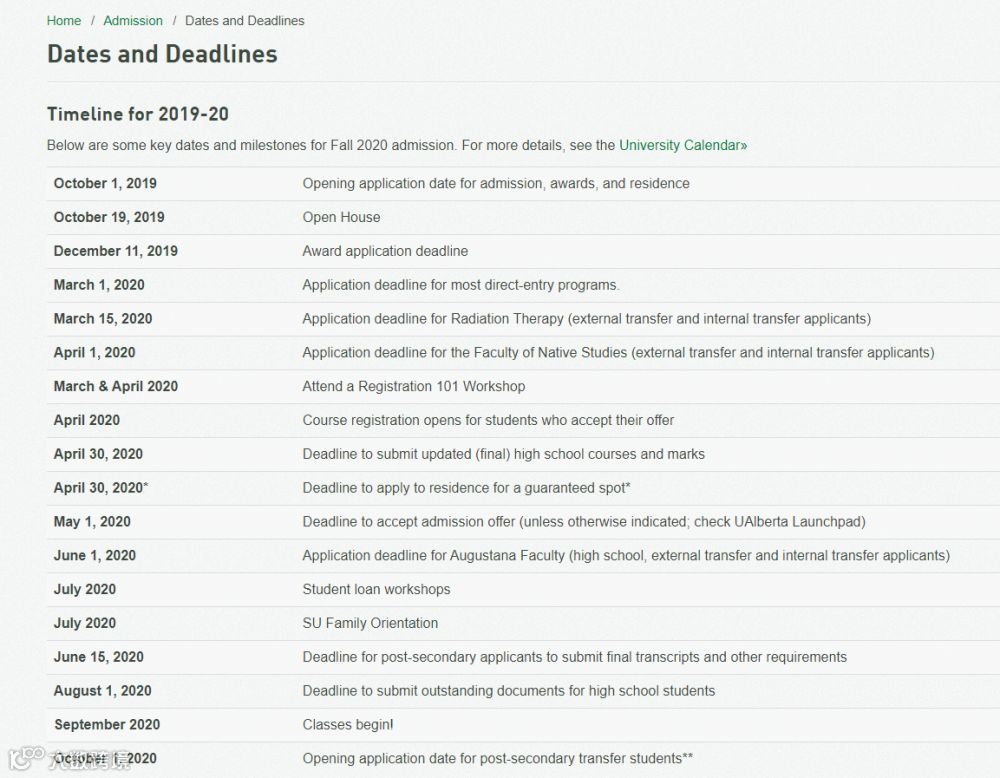 阿尔伯塔大学2020秋季入学申请截止日期为3月1日,材料截止日期中,教育学专业最早,为3月1日,工程类其次,为3月15日,其它专业为6月15日。