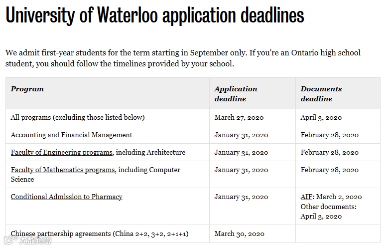 滑铁卢大学公布的申请截至时间是2020年3月27日,补充材料提交时间是4月3日。部分专业截止日期更早,工程专业网申截止日期为1月31日,材料截止日期为2月28日。数学院(包括其下属的滑铁卢的强势专业CS)也是这两个截止日期。
