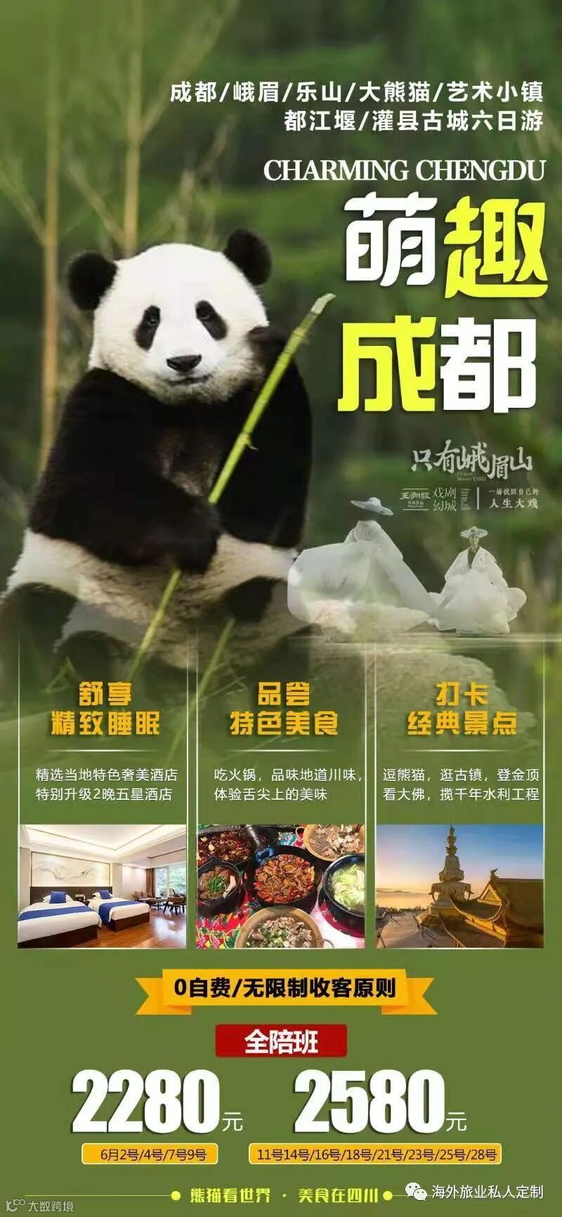 产品故事及亮点: 一座城,用美食惊艳了世界,用熊猫打开了世界,熊猫变身吃货大咖,邀您一起畅游蜀国。 01、不限制地区、同车人数、老年人、性别、职业、拖带,佛系收客规则。 02、河鲜宴+翘脚牛肉+富贵家宴+野菜餐+四川火锅,饮料不限量、吃好喝好再出发。 03、当地特色奢美酒店,升级2晚五星酒店、住得好才能玩得好。 04、船游乐山、360°观乐山大佛、拒绝上山长时间排队,悠闲慢旅行。 05、成都大熊猫基地看好多熊猫,憨萌可爱圆满旅途。 06、独家赠游老码头艺术小镇、灌县古城,体验成都市井生活。 07、都江堰景区游览,感受魅力的川蜀文化底蕴,见证古代劳动人民智慧。 08、赠送价值238元的只有峨眉山晚会,领略峨眉民俗独特魅力。 09、五星级管家式礼遇,金牌导游,24小时在线温馨服务。 10、外宾车队、专职司机,确保司机上下行李,空座率30%、舒适安逸玩天府。 11、同团进出、睡醒在出发、不早起、不摸黑、轻松慢游行。 12、温馨赠送:每人每天一瓶矿泉水。 |