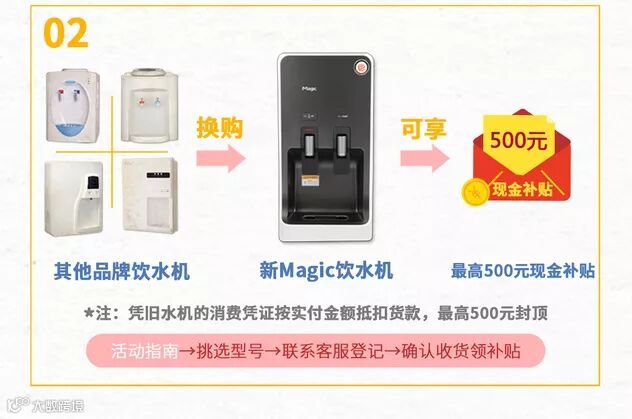 凭其他品牌饮水机可换购任意型号饮水机一台,凭旧水机的消费凭证按实付金额抵扣货款,最高500元封顶。