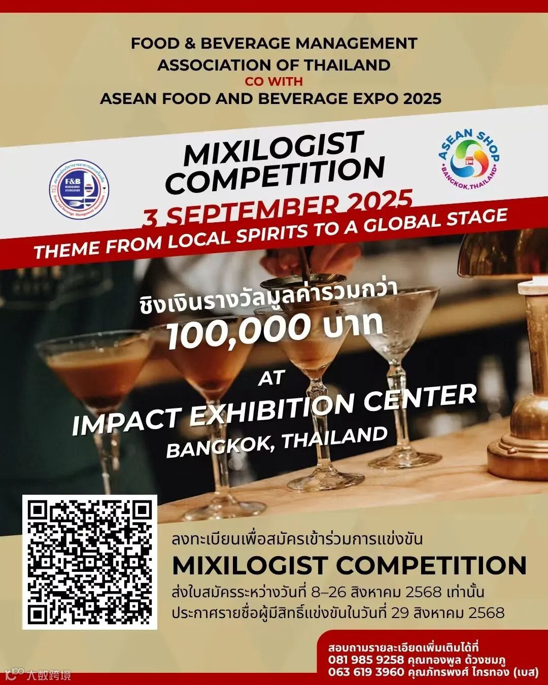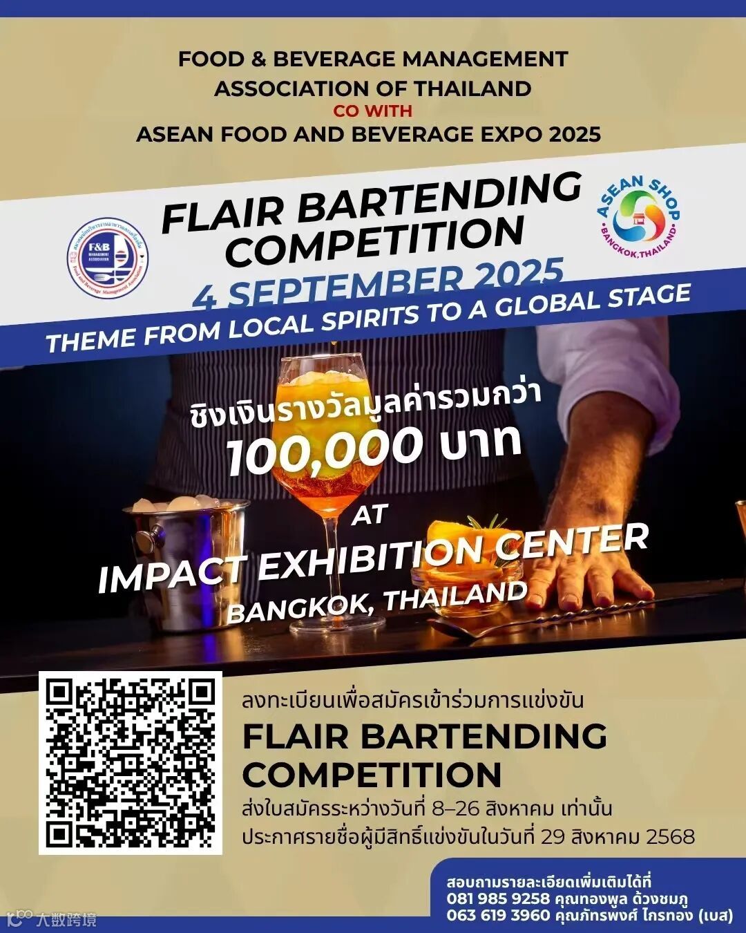 【曼谷讯】为促进泰国餐饮服务业创新升级,加强行业技术交流与商贸合作,泰国食品饮料管理协会将于 2025东盟商业博览会(ASEAN SHOP 2025) 期间,隆重主办 “花式调酒大赛暨调酒师竞技比赛”。本次活动将与博览会同期同地举办,打造一场集技艺展示、前沿设备体验与行业趋势洞察于一体的顶级赛事盛会。