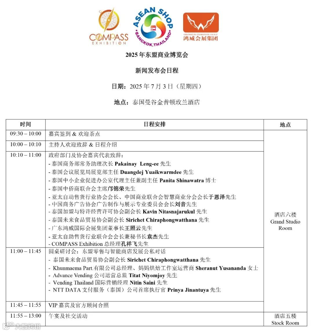【泰国讯】2025年7月3日(明日),泰国曼谷金普顿玫兰酒店将迎来一场汇聚政商领袖与行业先锋的盛会——2025年东盟商业博览会新闻发布会!本次发布会将正式揭晓东盟自助售货及自助服务设施博览会这一区域商业盛事的精彩规划,深度探讨塑造东盟无人零售与自助售货未来的关键议题。