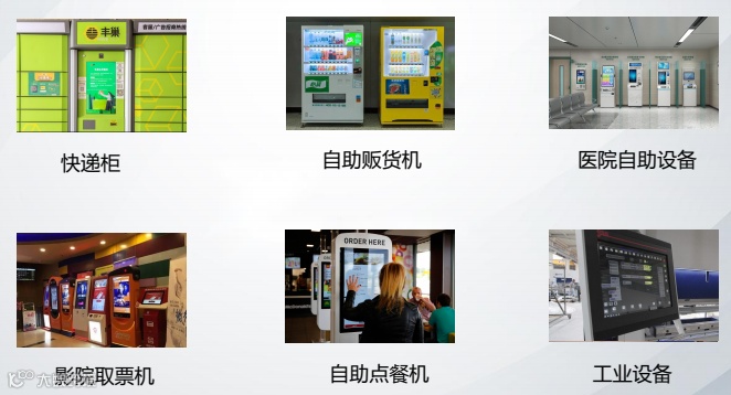21.5寸规格常用于金融行业、政务大厅等,如自助业务办理机;餐饮业可用于点餐机;影院用于取票机等。