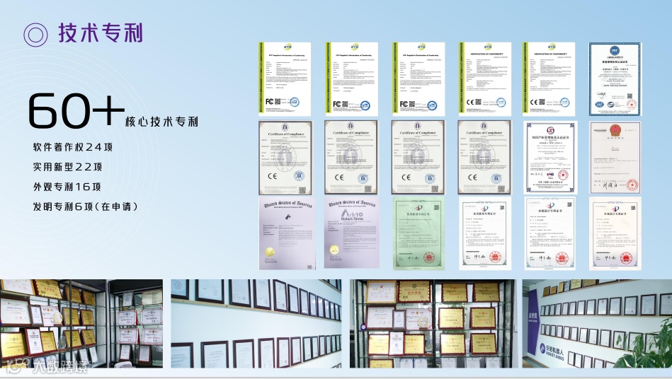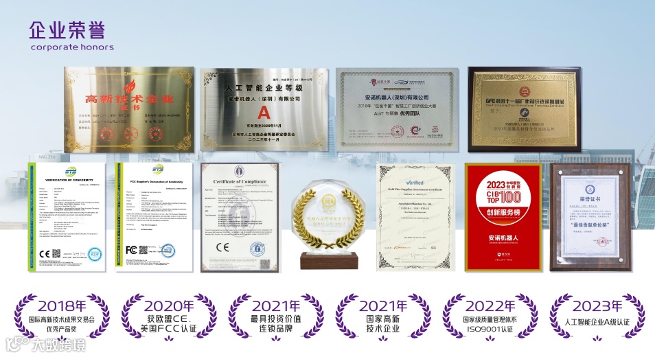 2021被认定为国家高新技术企业;2022国家ISO9001质量管理体系;安诺机器人(深圳)有限公司知识产权管理体系认证证书;2022国家创新型中小企业;《驱控一体工业机器人系统技术规范》最佳贡献单位奖;2023年度机器人典型应用案例奖;2023中华餐饮创新榜TOP100企业;国家首批人工智能A级企业称号;2024人气连锁加盟品牌;拥有60多项国家专利。