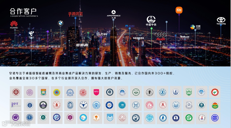 安诺机器人机械臂产品已取得70多项国家专利,产品销往国内100多个城市,销往全球50多个国家和地区,在全球桌面级机械臂及商用集成领域市场中占据相当比例市场份额。公司产品经过专业的第三方检测机构出具《质检报告》,已获得ISO9001质量管理体系认证、欧盟CE认证、美国FCC认证等。公司研发团队经过多年的技术积累和对行业的深入理解,先后推出了教育机械臂J系列,商业机械臂SJ系列,轻工业机械臂Q系列以及商业集成应用(机器人奶茶机、机器人咖啡机、机器人调酒机等)产品,凭借雄厚的技术优势和强大的研发能力,以及完善的售后服务体系,并配套提供相应的解决方案、定制化服务,能够满足教学、商业和轻工业等多行业的需求,赢得了国内外市场广大客户的信誉和青睐。