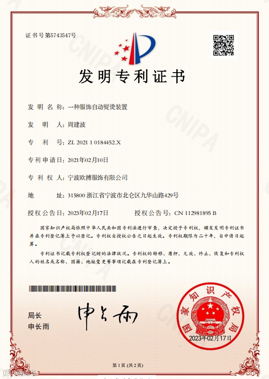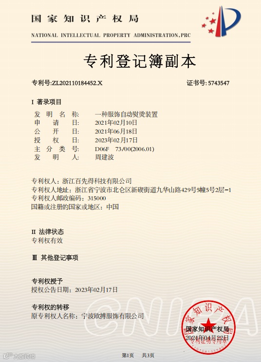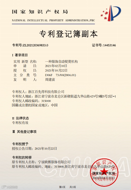 浙江百先得科技有限公司,是一家集研发、制造、销售和服务于一体的自主创新企业。公司位于浙江省宁波市北仑大港工业城,厂方面积为1500平方米,智能生产设备十多台,目前人员50多人,年生产能力为20000台机器。发明专利十余项,产品已获得3C、PSE、CE等认证。我们的智能衣物护理机项目自2019年立项以来,研发团队经过三年的技术开发和创新,于2022年顺利进入市场。这款智能自动衣物护理机集成了传统熨烫机和A赋能,让衣物保持挺括舒展、焕然一新的状态。现机器已经广泛应用于各大酒店、公寓、学校。我们致力于为用户提供更高品质、省心的衣物护理体验。我们的目标是成为您信赖的衣物护理解决方案的首选品牌。