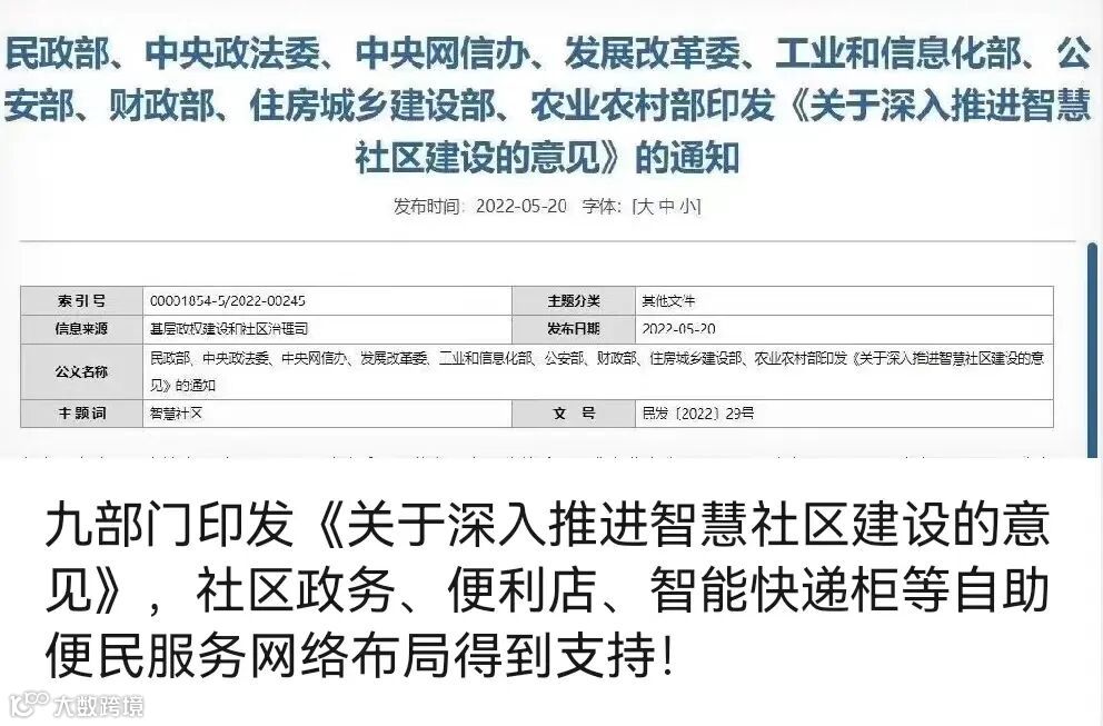 九部门印发《关于深入推进智慧社区建设的意见》,社区政务、便利店、智能快递柜等自助便民服务网络布局得到支持!