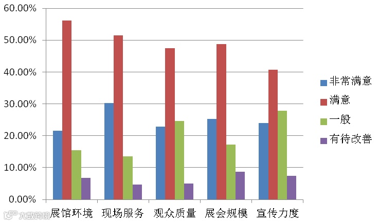 【图例说明】数据显示,87.43%的参展商对展馆环境、展会现场服务、展会规模、展会宣传力度及观众质量表示满意/非常满意。