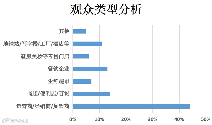【图例说明】数据显示,本届展会主要的参观类型为设备运营商/经销商/加盟商,其次是商超/便利店/百货、餐饮企业以及地铁站/写字楼/工厂/酒店等。