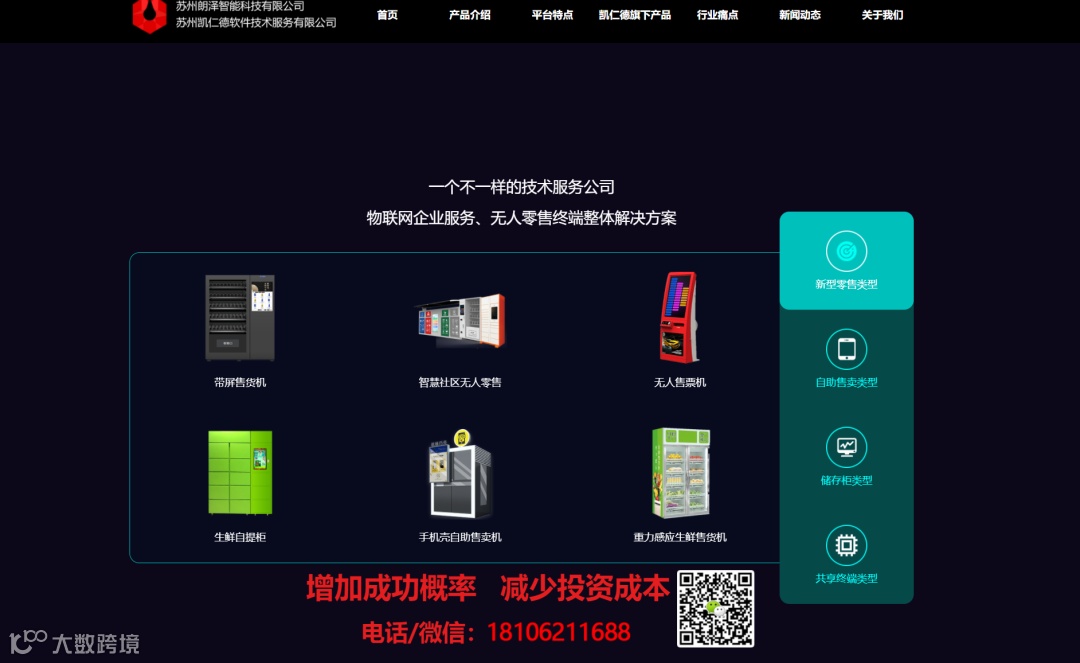 苏州凯仁德软件技术服务有限公司是一家专注于软件研发与硬件生产于一体的自动售货机厂家。包括,自动售货机,无人售货机,饮料自动售货机,成人用品自动售货机,果蔬生鲜自动售货机、各类格子售卖柜、售卖机、自动售货机、 无人售货机、药品售货机、早餐售货机、无人柜/店、手机壳售卖机、无人煮面售卖机、人脸终端售卖机、共享终端售卖机等多种智能零售 终端,实现一个平台多种设备混合管理的场景体验。同时平台基于海量终端数据为运营商提供运营决策、广告、线下引流、代运营及供应链支持等增值服务。通过无人终端设备帮助品牌商及运营商挖掘零售的数据价值!