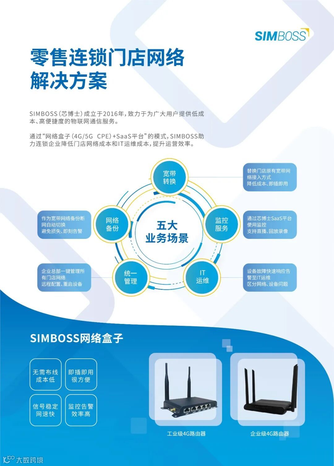 SIMBOSS(芯博士)通过4G/5G CPE+SaaS服务+大数据分析将运营商的网络通信能力整合成物联网信息通路解决方案,为广大用户提供低成本、高便捷的物联网通信服务。