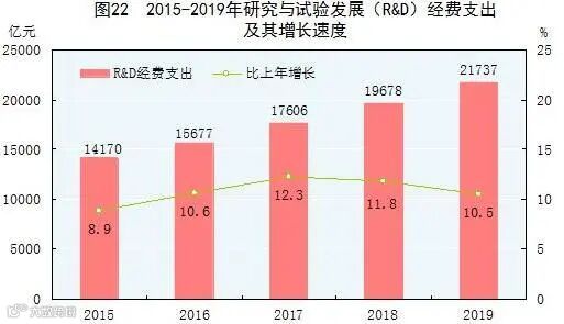 其实在近年来,我国已经加大对科技的重视,在科技创新的投入不断提升。2019年全国共投入研究与试验发展经费21737亿元,比上年增长10.5%;国家财政在科学技术方面支出9518.2亿元,比上年增加1134.6亿元,增长13.5%。2019年我国研发经费投入强度达到2.19%,已经接近经合组织2.37%的平均水平。