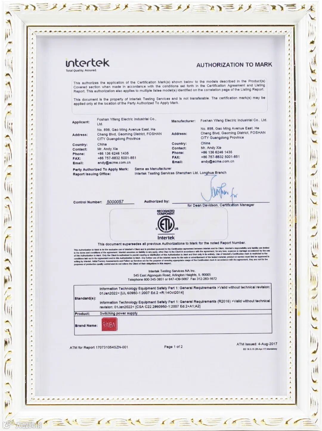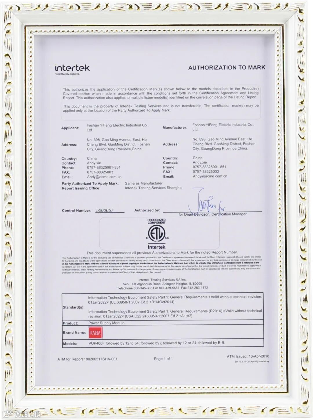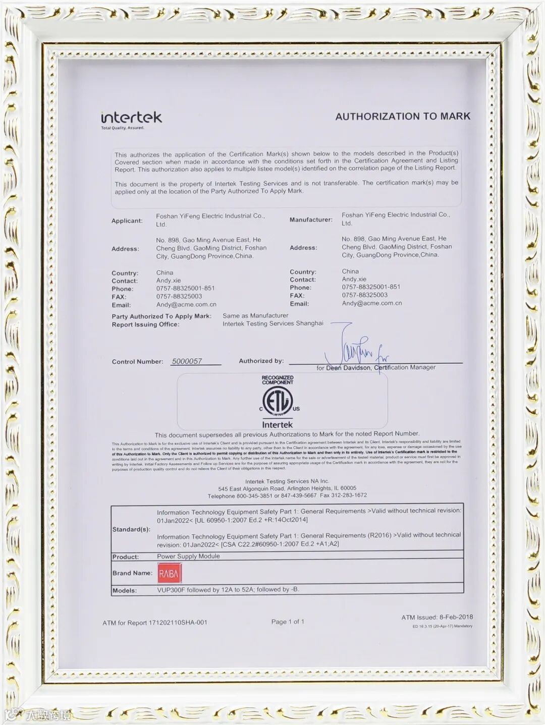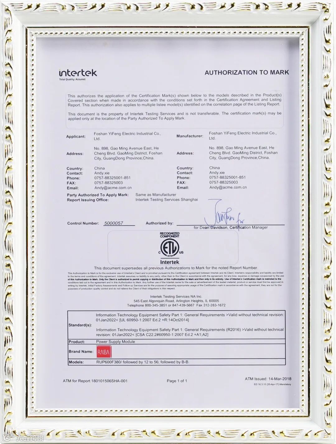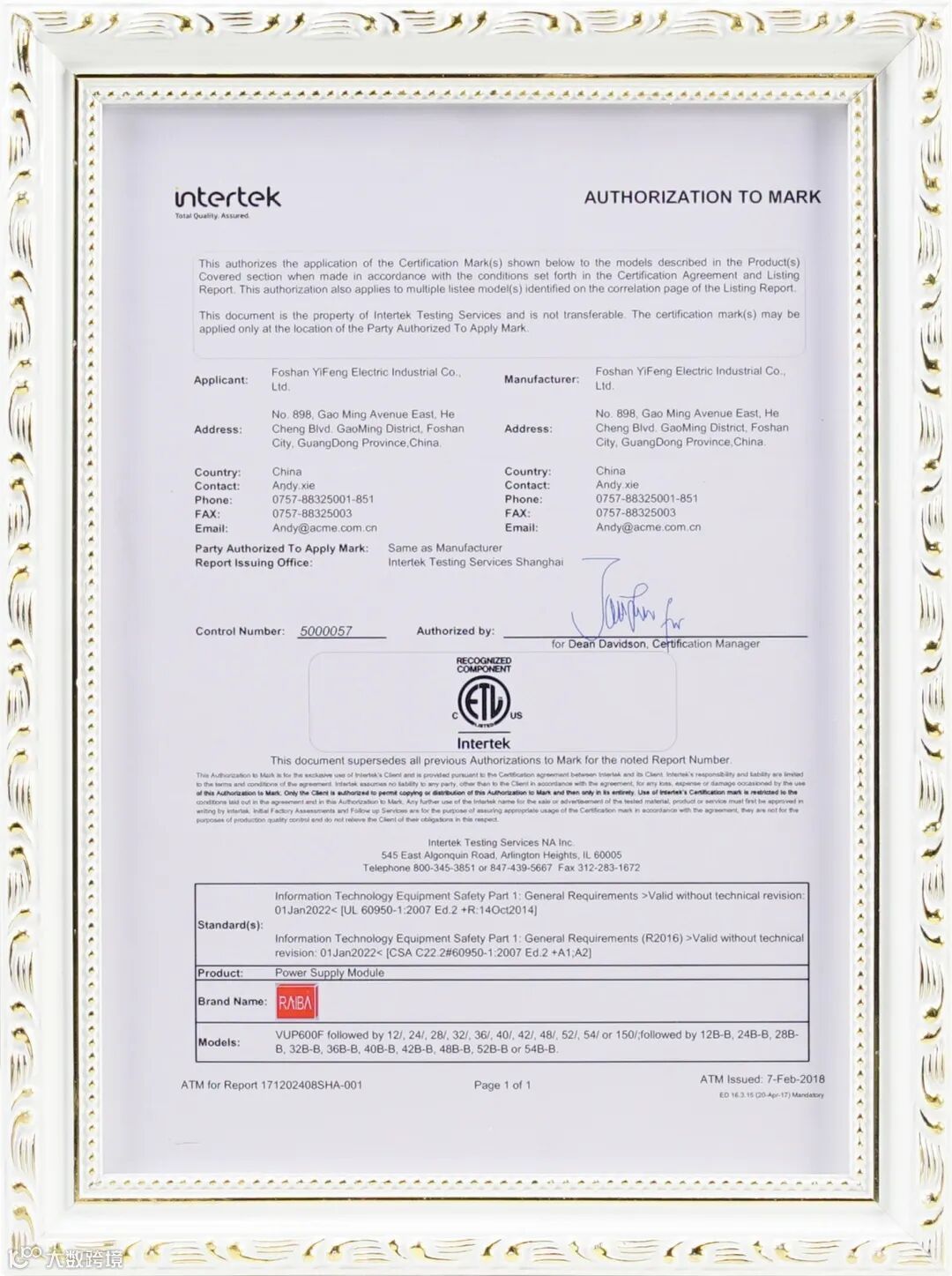 锐霸8大系列电源产品通过ETL认证,并获得证书;