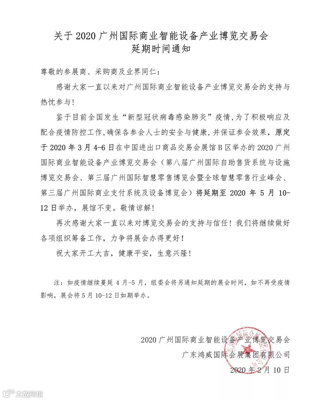 鉴于目前全国发生“新型冠状病毒感染肺炎”疫情,为了积极响应及配合疫情防控工作,确保各参会人士的安全与健康,并保证参会效果,原定于 2020 年 3 月 4-6 日在中国进出口商品交易会展馆 B 区举办的 2020 广州国际商业智能设备产业博览交易会(第八届广州国际自助售货系统与设施博览交易会、第三届广州国际智慧零售博览会暨全球智慧零售行业峰会、 第三届广州国际商业支付系统及设备博览会)将延期至 2020 年 5 月 10- 12 日举办,展馆不变。敬情谅解!