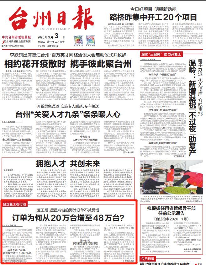 星星冷链的中高层,这个春节都没有过好,比平常工作时间还长,努力筹备复工事宜。按照原定计划2月1日上班,却一推再推,直到2月15日才正式复工,整整晚了半个月,但星星冷链已是椒江首批复工企业之一。