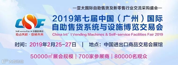 2019年2月25—27日,广州国际自助售货机展组委会在广州·中国进出口商品交易会展馆B区打造“2019中国(广州)国际自助售货系统与设施博览交易会”。此次展会覆盖规模达50000平方米,展商700+,专业观众人次80000+——打造具有行业影响力的高端交流盛会。中国自助售货+新零售行业开年首展,欢迎各位莅临参观!
