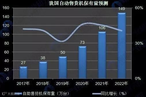 根据国外发展经验,中国内地售货机应用市场启动期至少应布机10万台,年生产总值在10亿元人民币,到发展期至少应布机50万台,年生产总值应达到100亿元人民币,而到成熟期将达到300万台,年生产总值将达到600亿元之巨,届时中国的自动售货机将发展成为一个巨大的产业,中国的自动售货机产业将实现快速增长,初步估计自动售货机的年投放量将达到10万到20万台,年产值增长20-40亿元人民币,预计到2022年,我国自助售货机保有量达到149万台。