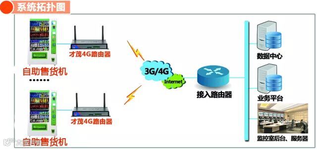 系统通过工业级3G/4G全网通路由器,为自动售货机提无线网络传输,实现自动售货机和用户不同后端平台的联网功能,系统主要包换前端自动售货机、才茂网络传输数据采集系统和云管理平台三个部分。