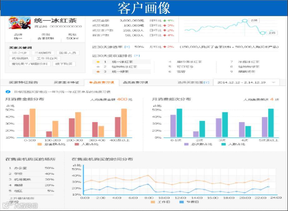 消费金额频次、购买场所及时间分布、购买渠道分布、购买场所分布、产品关联购买特征、关联类目上的品牌&产品&渠道分布。