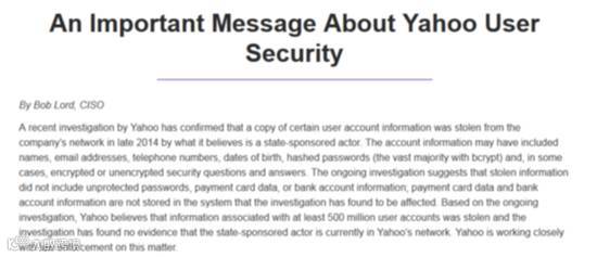 2016年9月22日,互联网巨头雅虎官方对外发布消息,承认在2014年的一次黑客袭击中,至少5亿用户的数据信息遭窃。此次事件成为了有史以来规模最大的单一网站信息泄露事件,一经爆出立刻引发轩然大波。
