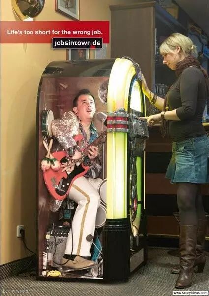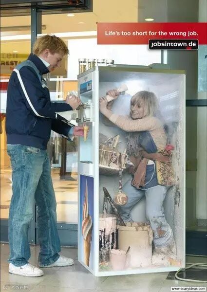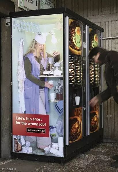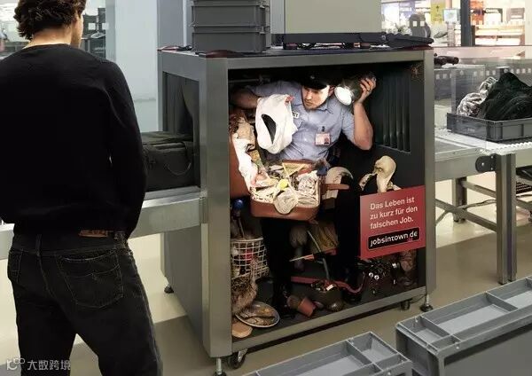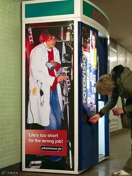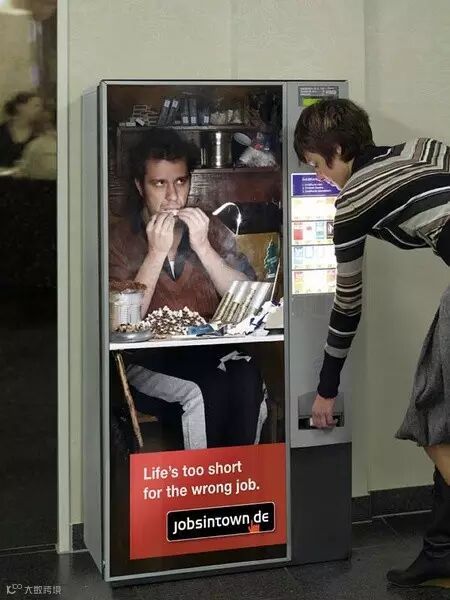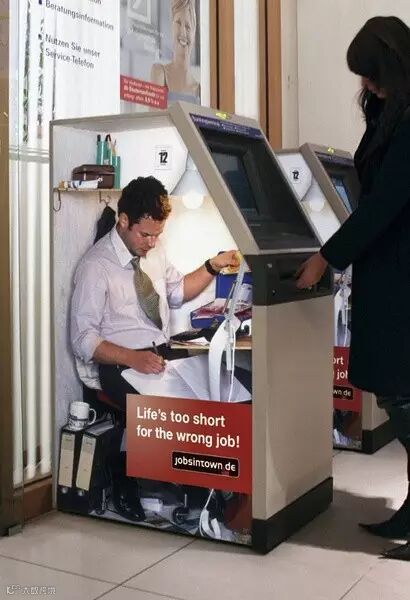 相信许多人都看到过这系列有趣的广告。这系列广告是由广告代理商Scholz & Friends 为德国的人力银行公司Jobsintown.de所制作的宣传广告。Jobsintown.de也因为这标题为《生命不该浪费在错误的工作上》系列广告而闻名,并获得了2007纽约国际广告节[户外类]金奖。