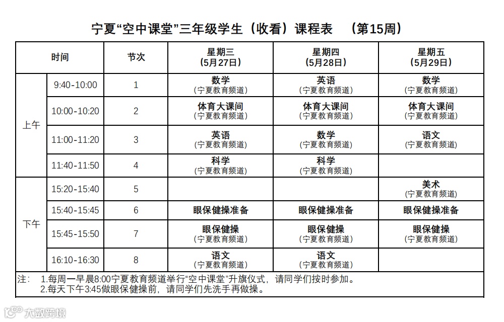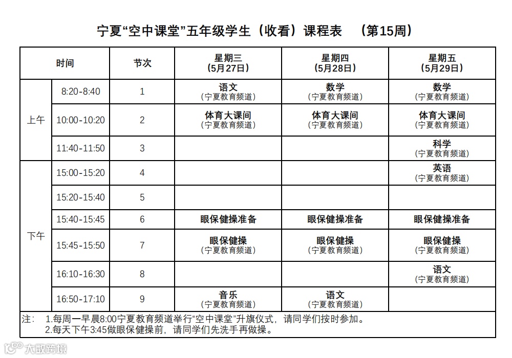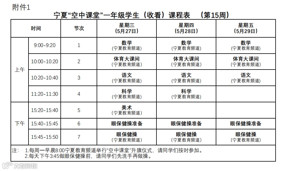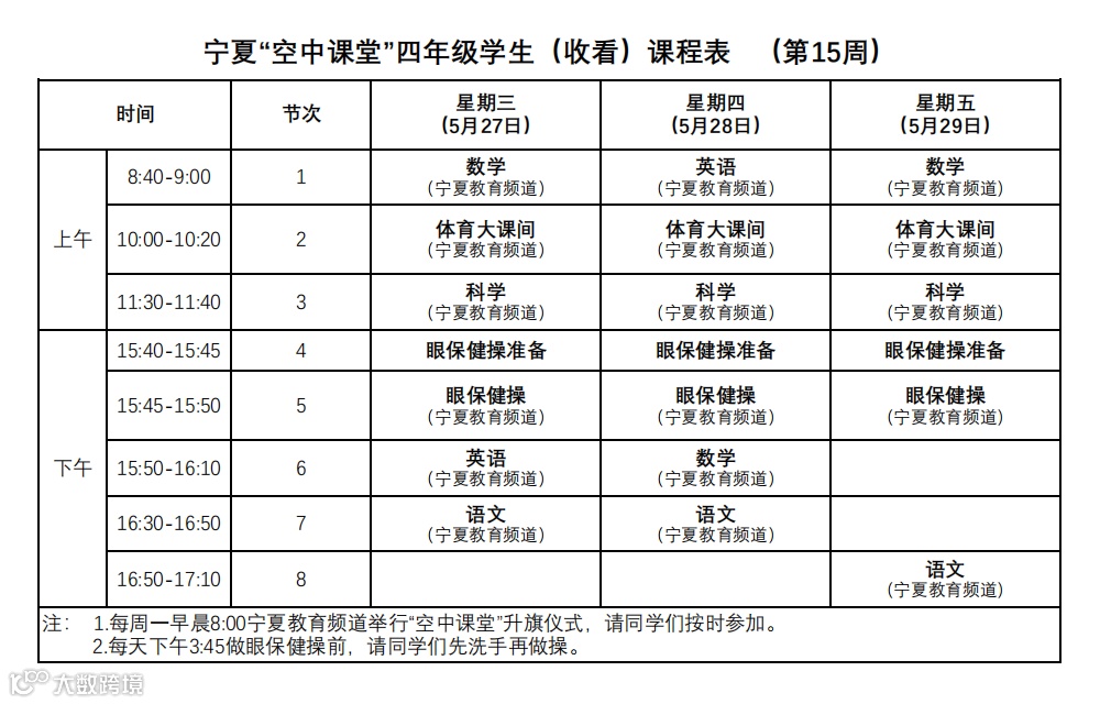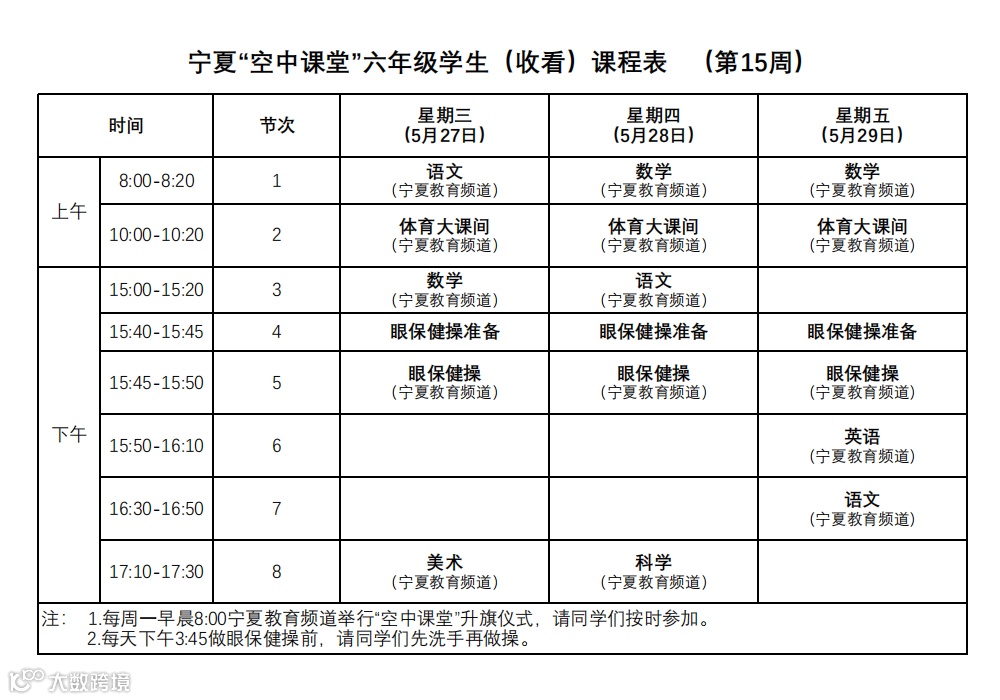 宁夏“空中课堂”小学生课程表(第15周)
