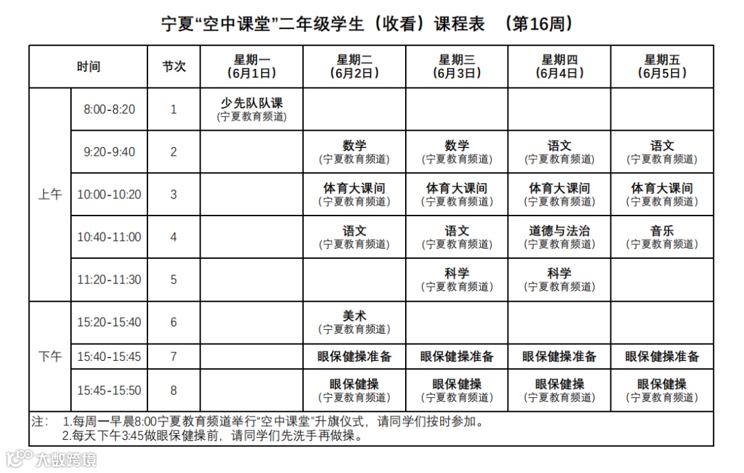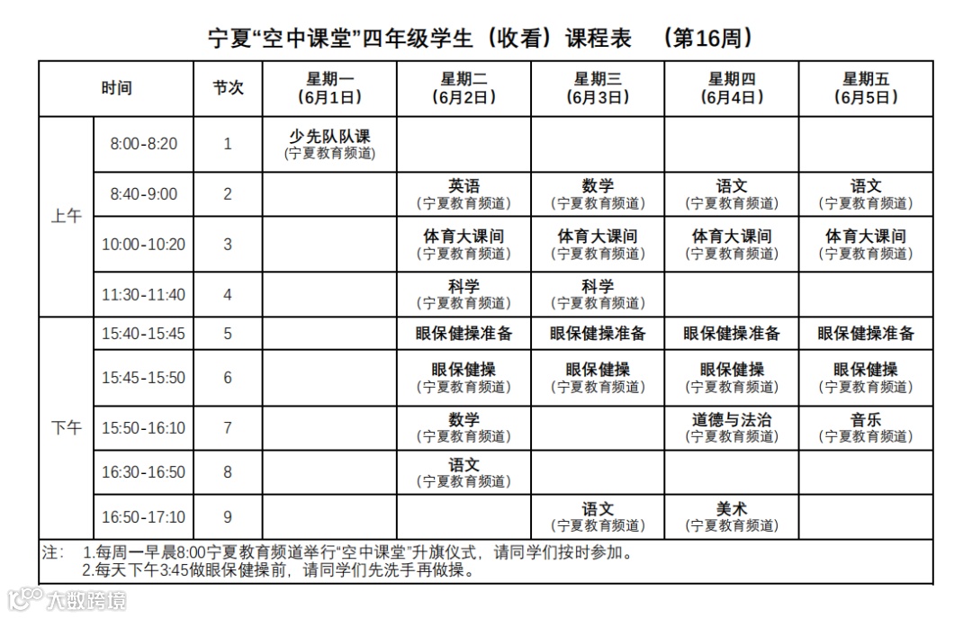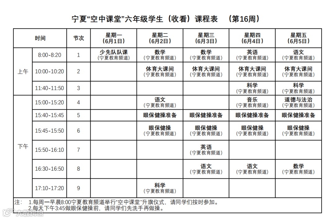 宁夏“空中课堂”小学生课程表(第16周)