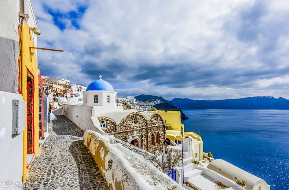 白色屋宇,狭窄的巷道,露天咖啡 座及点缀于陡峭山坡上的小商店组成了圣托里尼的印象。