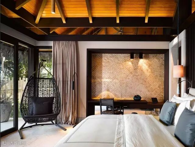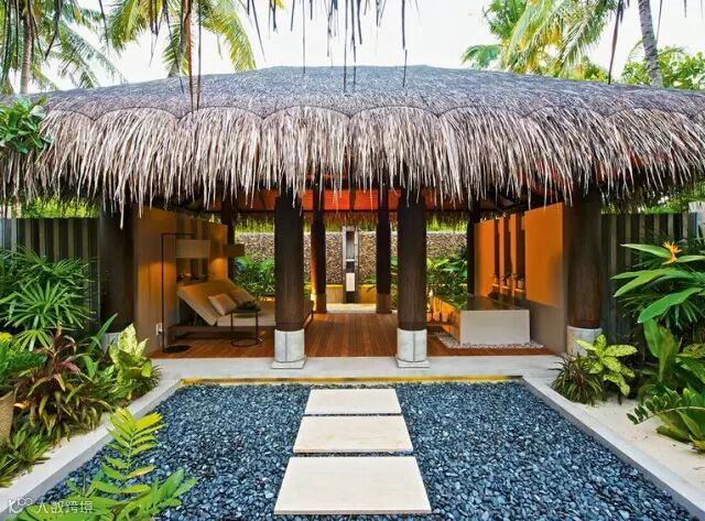 室内设计采用天然材料与色彩,充满素雅自然之风,悬挂椅平添一丝灵动与趣味。单卧海滩泳池私人别墅配备一间宽敞的独立起居室、室外露台、私人泳池和室内浴室。充满禅宗格调的户外浴室配备超大浴池和甲板,经由中庭花园可来到一处圆柱形礼台,礼台下方设一张舒适躺椅。位于泳池边的露天用餐区是日落时分的最佳休憩之地。