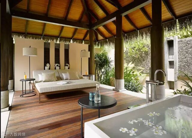 别墅的设计风格如梦似幻,可饱览迷人的海洋风光,私人泳池可观赏到壮丽的日落美景。别墅之间以帆布风帆隔开,保证最佳私密空间。茅草屋顶为露天用餐区遮挡住阳光,卧室和浴室均可通往露台。