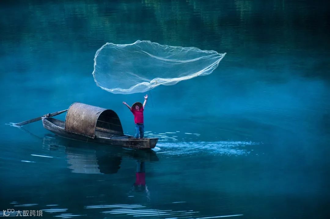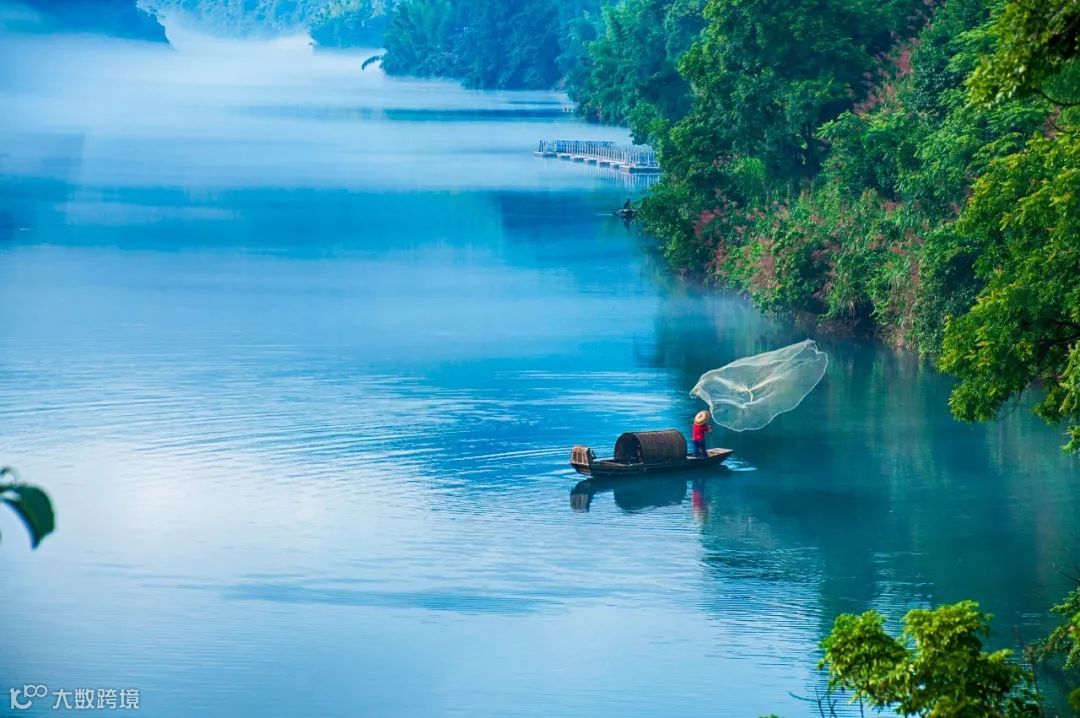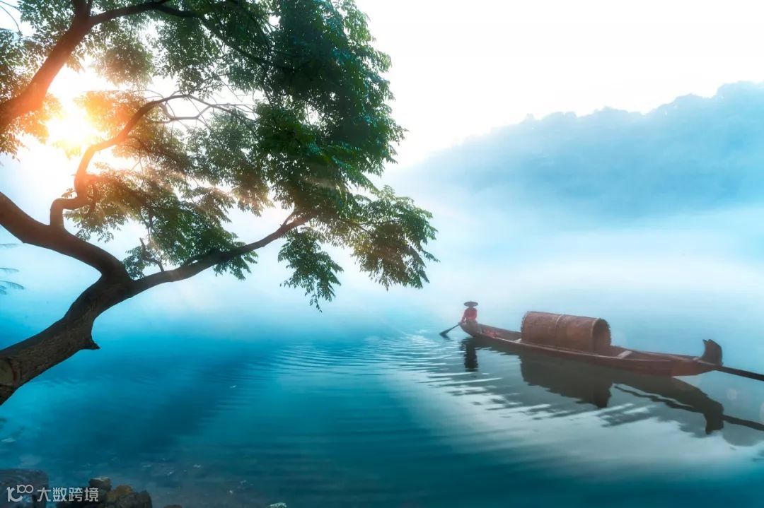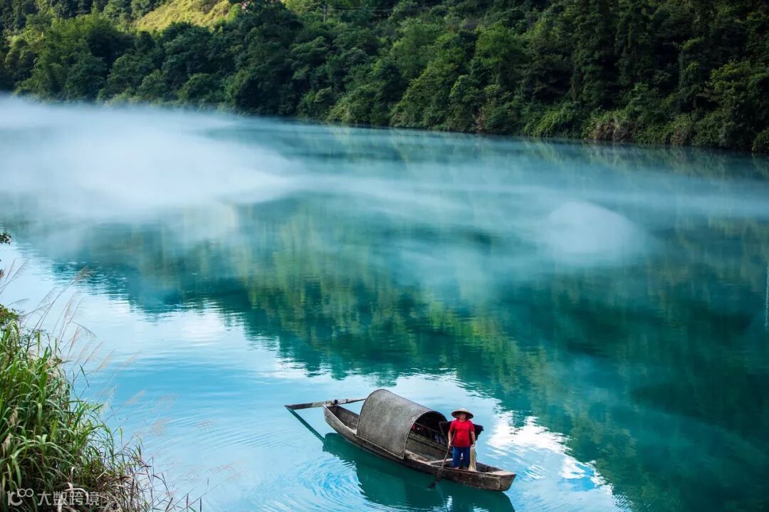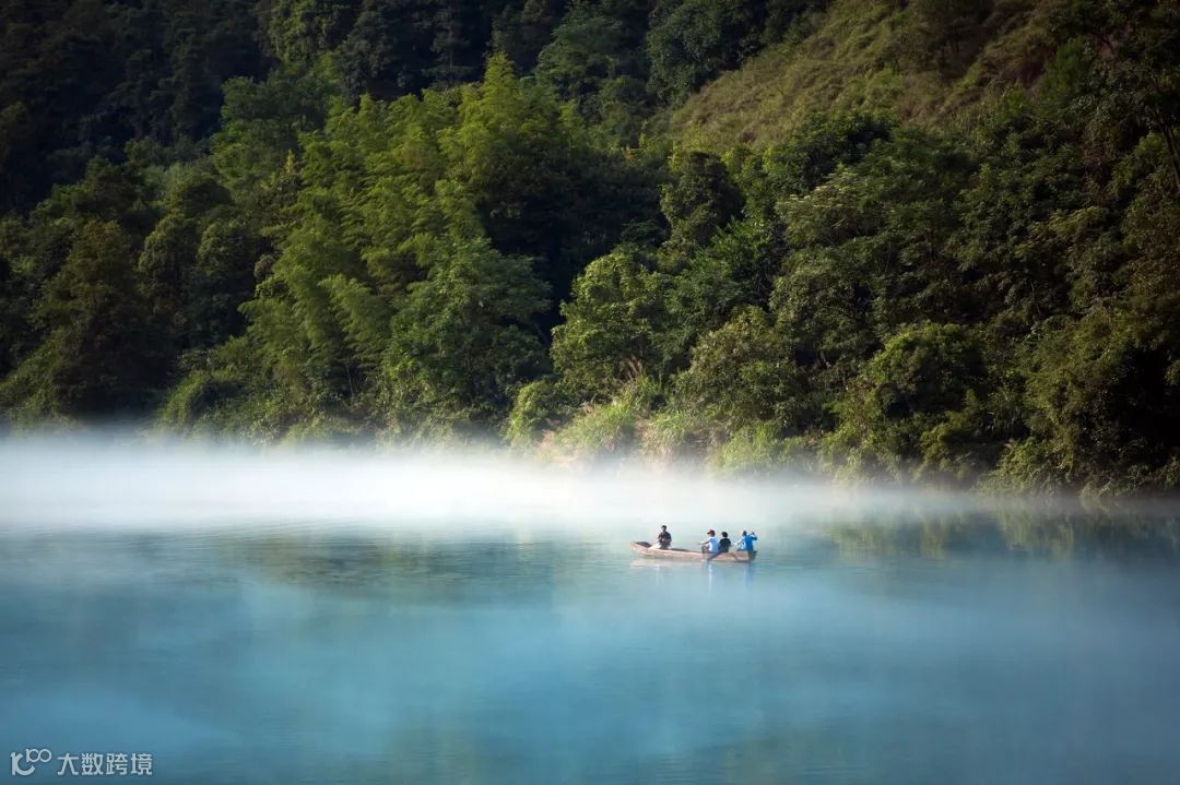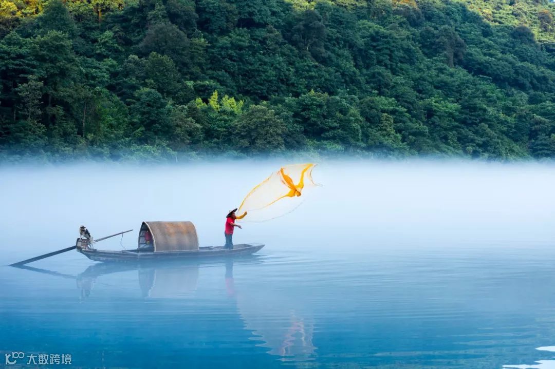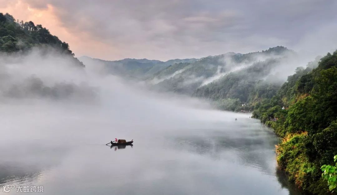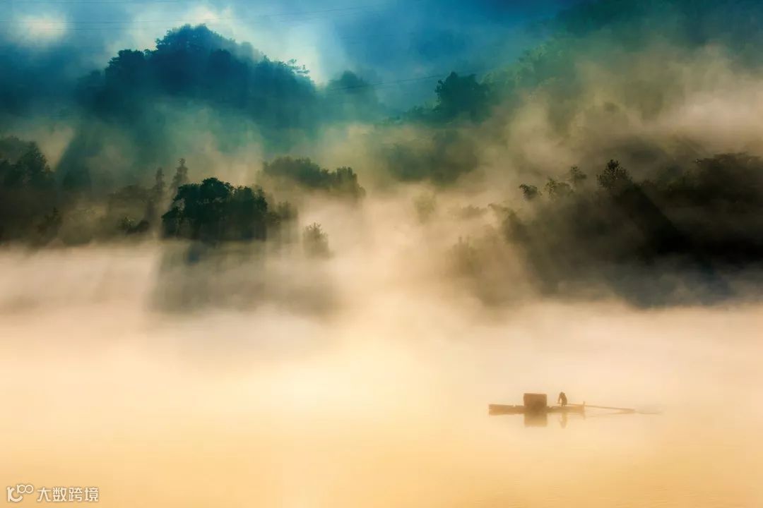 云雾弥漫的清晨,如梦如幻,小船轻轻划过江面,四周静悄悄的,像一处遗落在人间的唯美仙境。