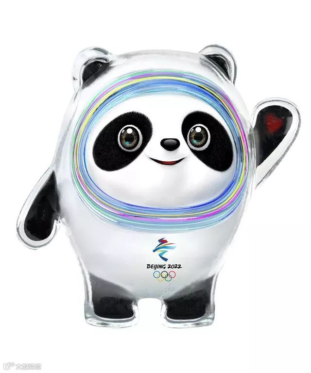 将熊猫形象与冰晶外壳相结合,体现了冬季冰雪运动的特点。熊猫头部装饰彩色光环,其灵感源自于北京冬奥会的国家速滑馆——“冰丝带”。