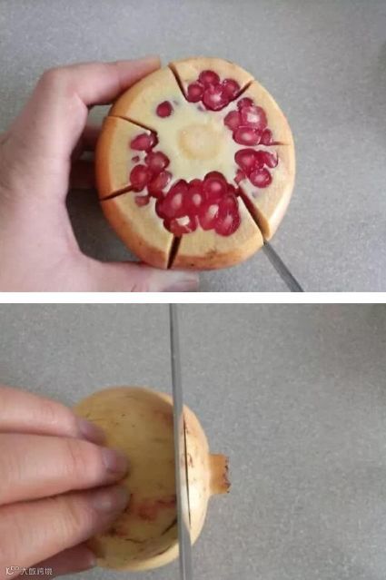 我们在石榴头部大约5分之一处,用小刀横着刮一圈!注意石榴皮不厚,我们不要刮的太深,以防伤到里面的果实!现在大家看,石榴里面的纹路非常的清晰,我们再用小刀沿着石榴的纹路轻轻一刮,然后把它掰开,你瞧,完完整整的,非常漂亮,吃起来更方便。