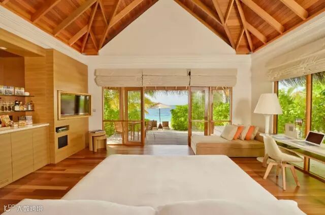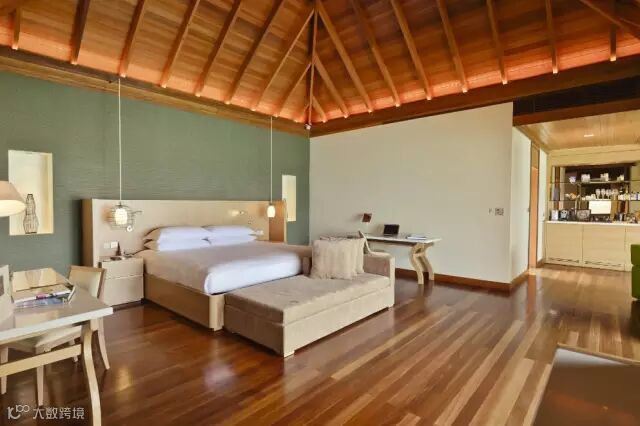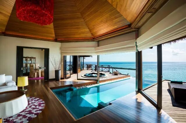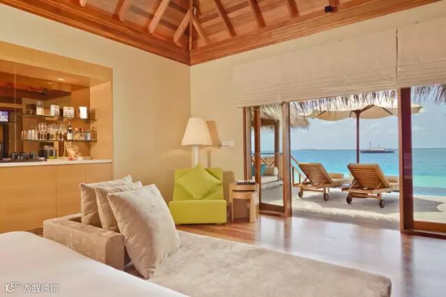 位于上层的主卧房大量采用玻璃建材,通过主卧室的玻璃地板,可以一眼望到蔚蓝透明的海水。同样整片的玻璃墙让您知道蓝色珊瑚礁的奥妙。穿过专用的楼梯井,到室外花园,露天淋浴。豪华的按摩浴缸,能让您如初生婴儿般娇嫩。宽敞的副卧室有独立的观景露台,有室内和户外开放式的卫浴设备,从餐厅俯瞰泳池,池水是从别墅外的海水涌入。在用餐区享受美食之际,不仅可欣赏自然造景的水塘。起居室当然少不了bose环绕音响及60"等离子电视等高科技视觉享乐。"thakuru"(贴身管家)会24小时提供您完善的服务,满足您任何的需求。