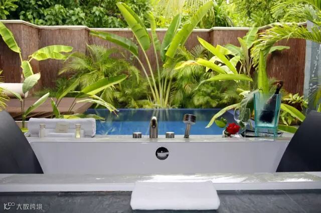 比海景豪华按摩池别墅面积更大,设备与一般海景别墅相同,差别出于室内外空间及泳池较为宽敞,室内采用更精致典雅的家居点缀,躺在房间前面的木质光景露台上观赏五彩斑斓的热带鱼或是慵懒的在沙发床上观看日出、日落,体验热带季节的变化无穷,屋外花园中有大泳池,前院有多张圆形睡椅。