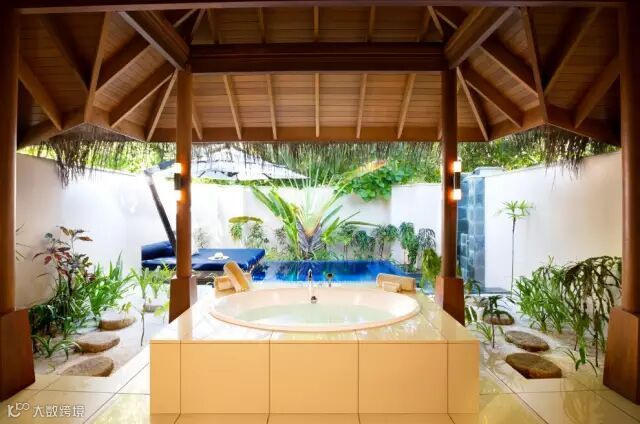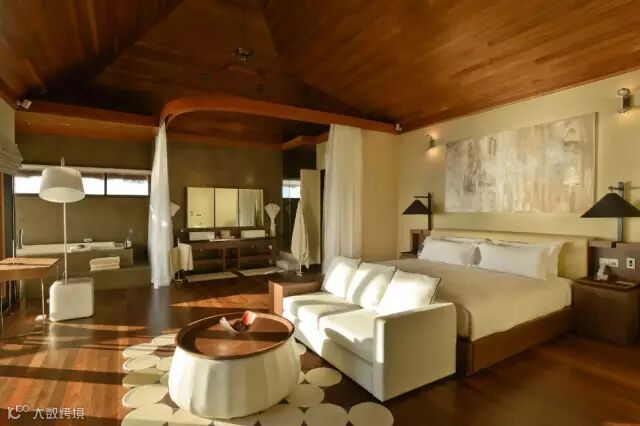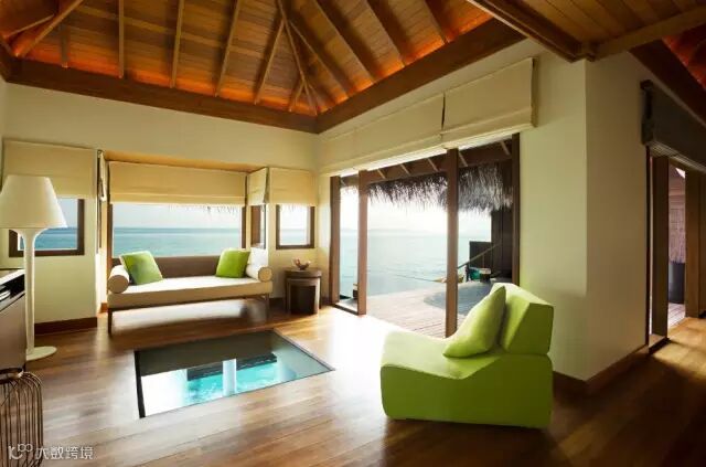 在这里可以眺望印度洋,或可坐拥日落美景,此型的水上屋处于深水区域,会有较多鱼群出现在下方,室内大厅拥有玻璃地板可欣赏海面下的热带鱼。室内浴室采用超大圆形按摩浴缸,大型景观窗让你泡澡时也能一饱印度洋的湛蓝。